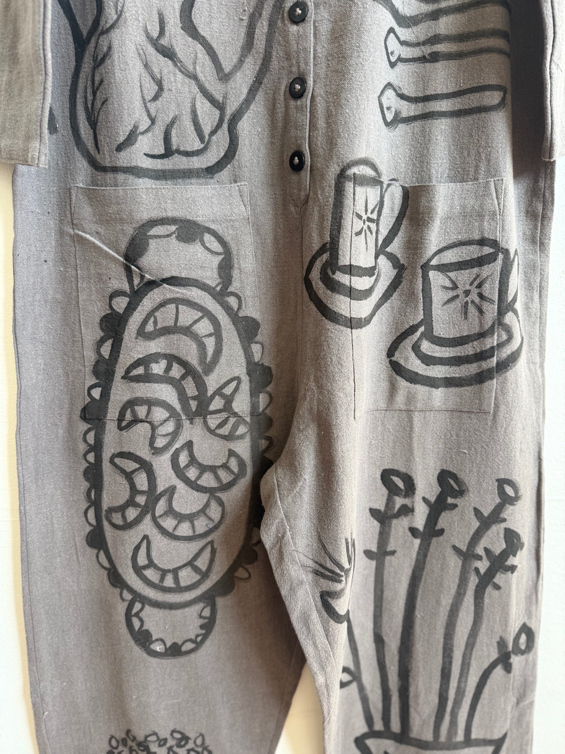 One of a kind hand-painted jumpsuit. Made from homespun, handwoven 100% cotton. 2 pockets in front, one behind. Hand painted in our studio in San Francisco.