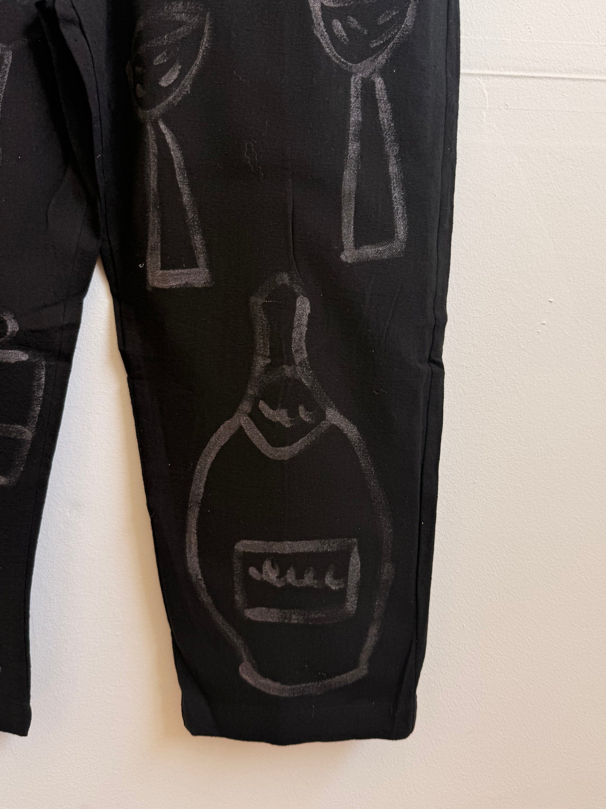 One of a kind hand-painted jumpsuit. Made from homespun, handwoven 100% cotton. 2 pockets in front, one behind. Hand painted in our studio in San Francisco.