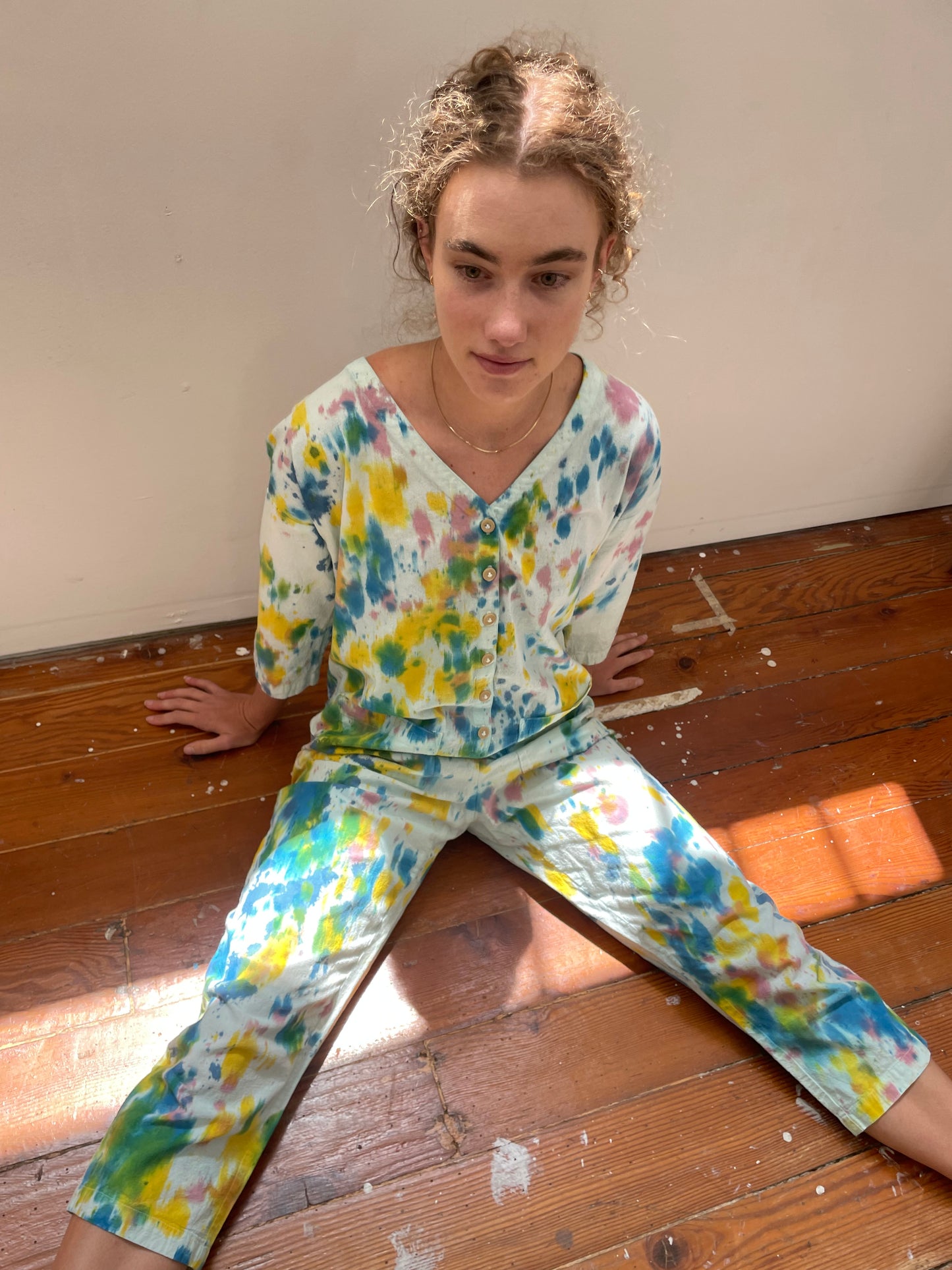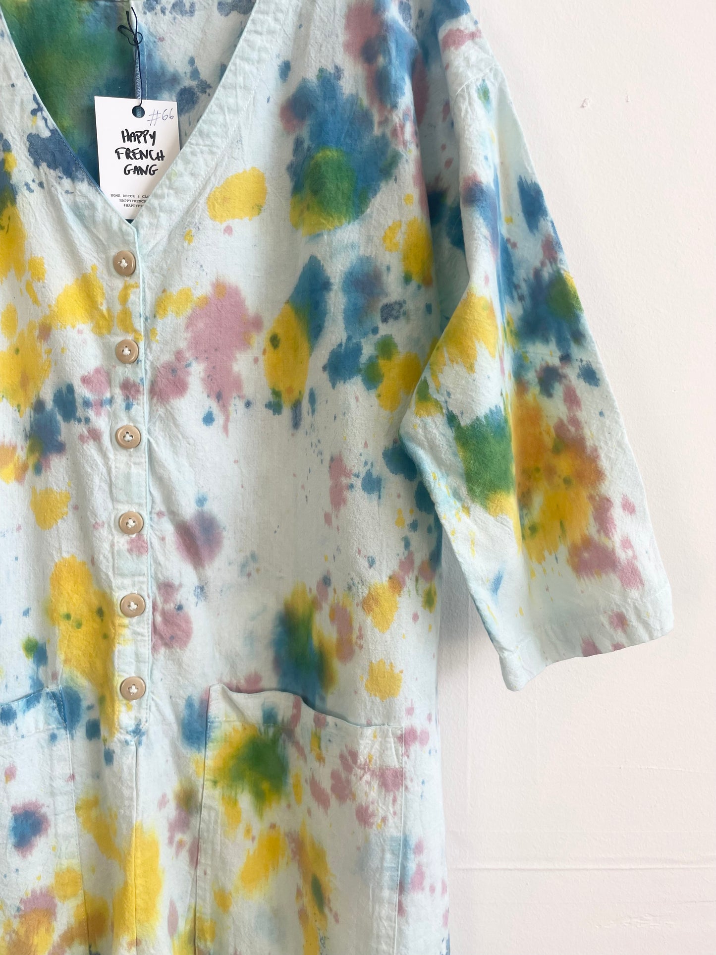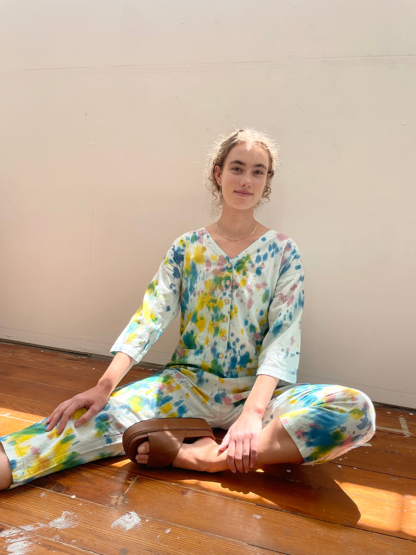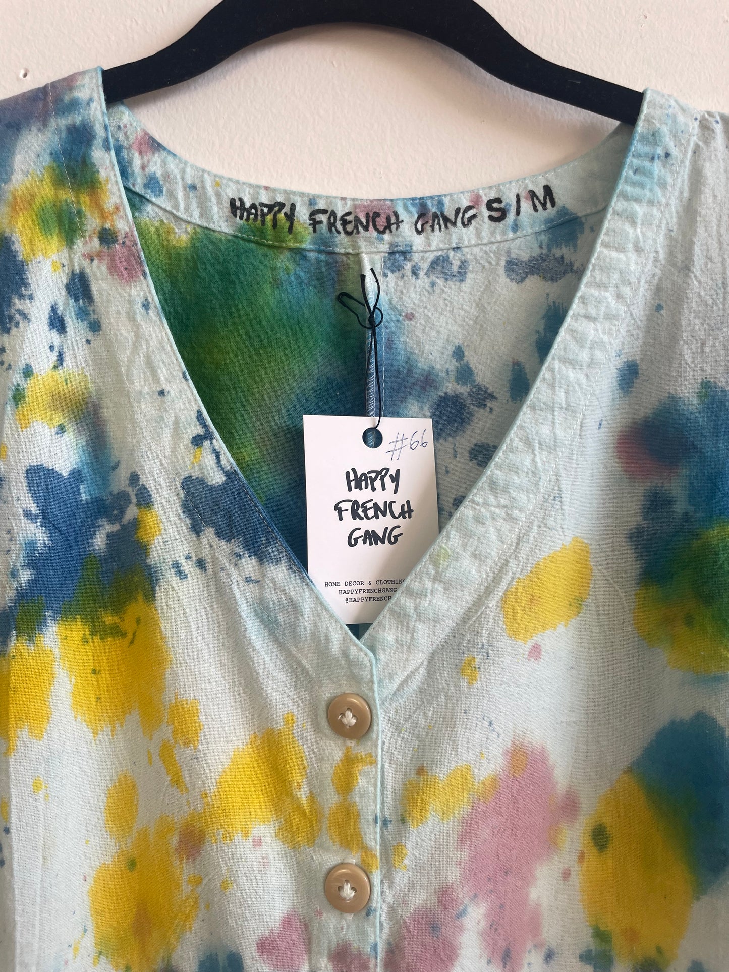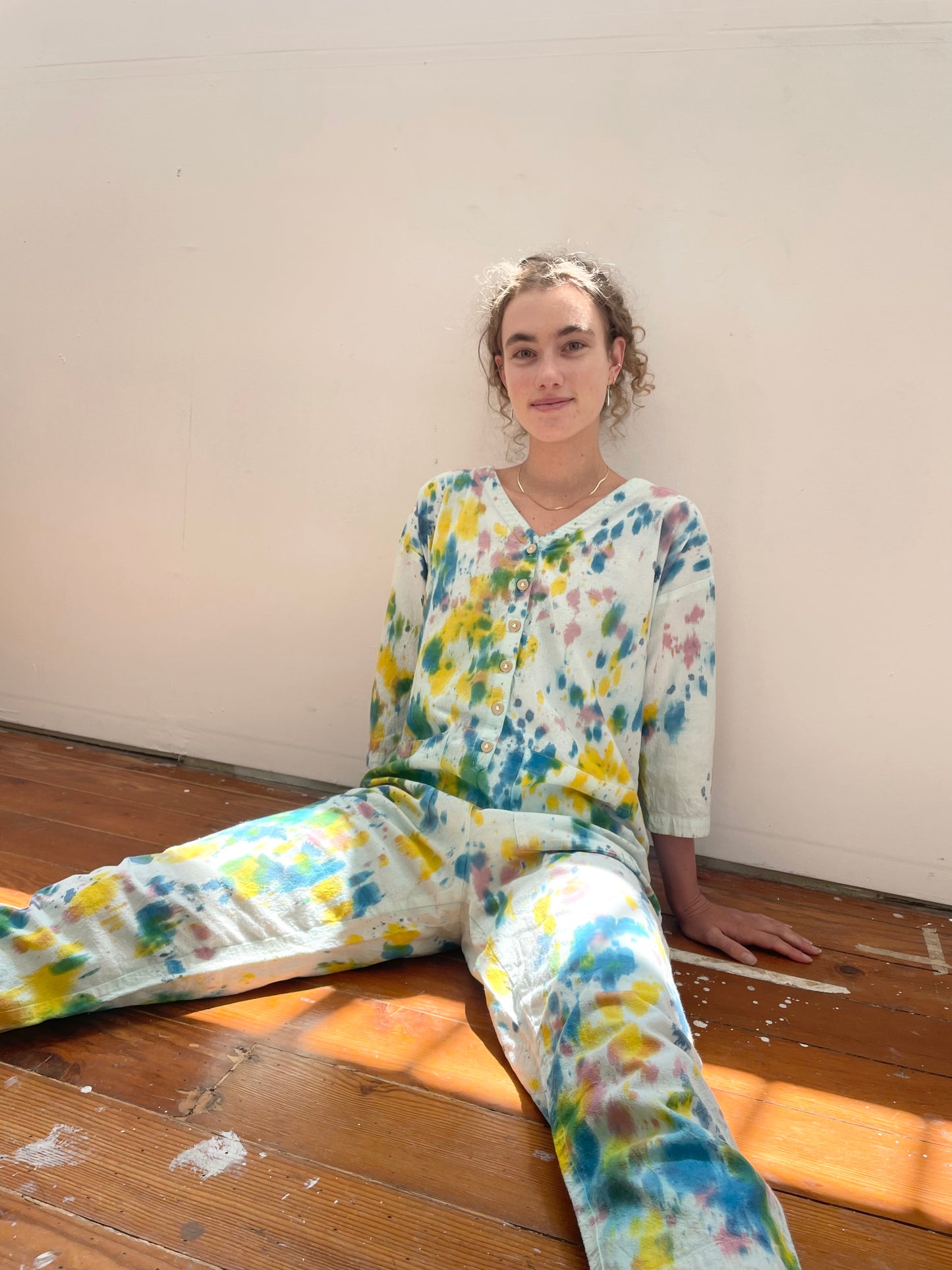 This tie-dye collection has been created with the only goal to reduce our waste at Happy French Gang. We sometimes have plain color pieces that have small color imperfection. We love them but it’s hard to sell them without seeing in person. That is why I decided to transform them completely and make the most colorful and happy pieces.