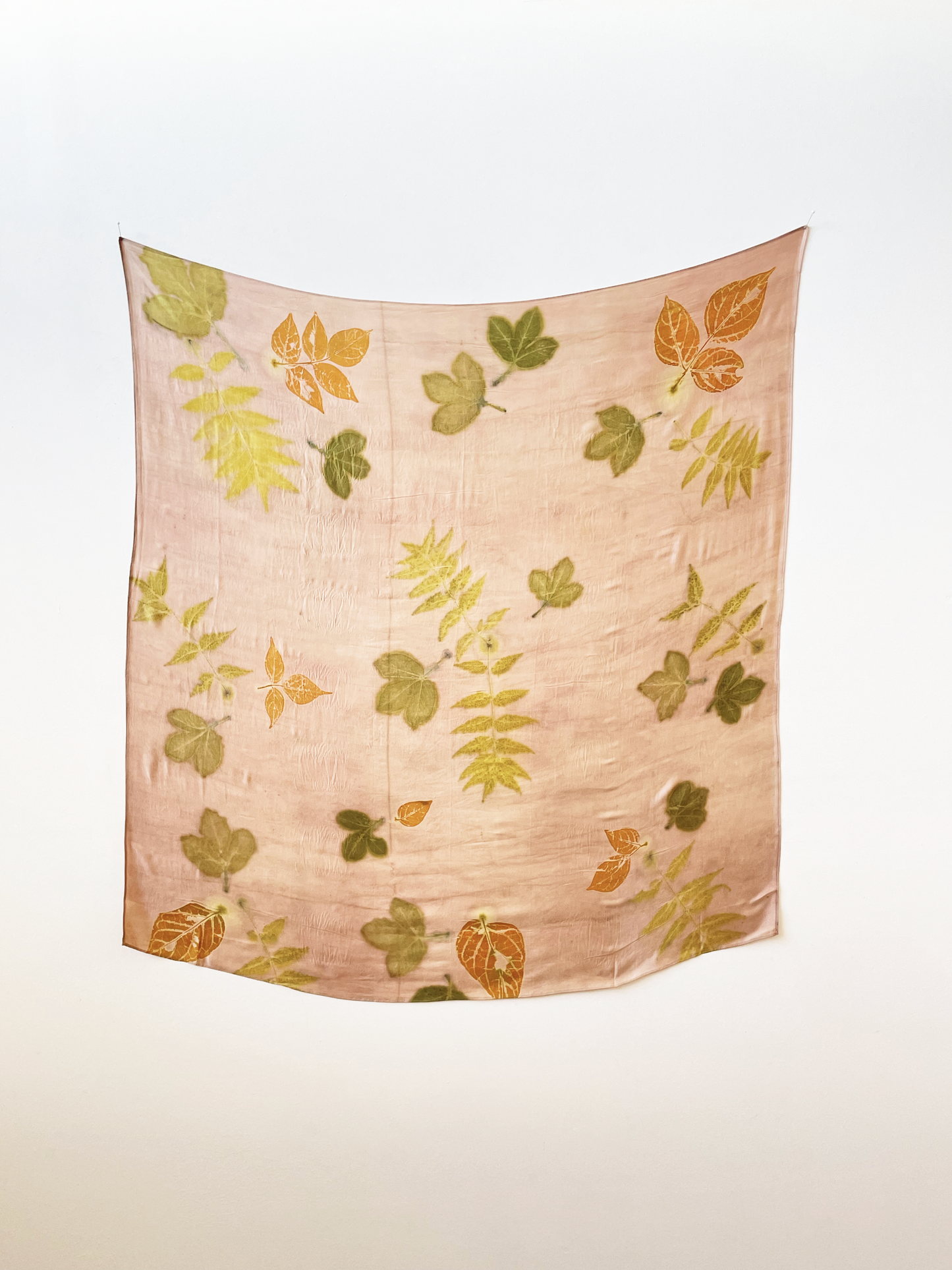 It is handpainted using ancient artisanal technique known as eco-printing - all done by hand, no machines. Living dye plants in Bali are pressed onto the luxurious silk, bundled, and then heated to transfer its colors and patterns. We enjoy this delicate process as we learn to surrender to the unpredictable but always groundbreaking results.