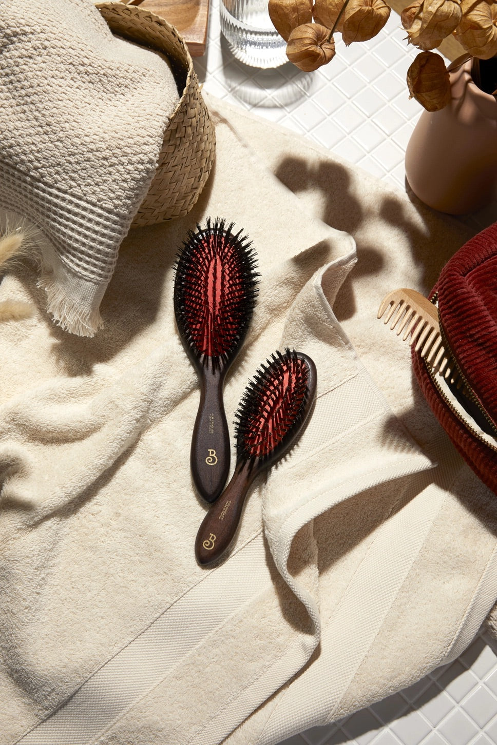 Natural boar bristles: - act as a hair care treatment - distribute sebum from roots to ends - provide softness and shine to hair - The brush you need for a perfect sleek look.