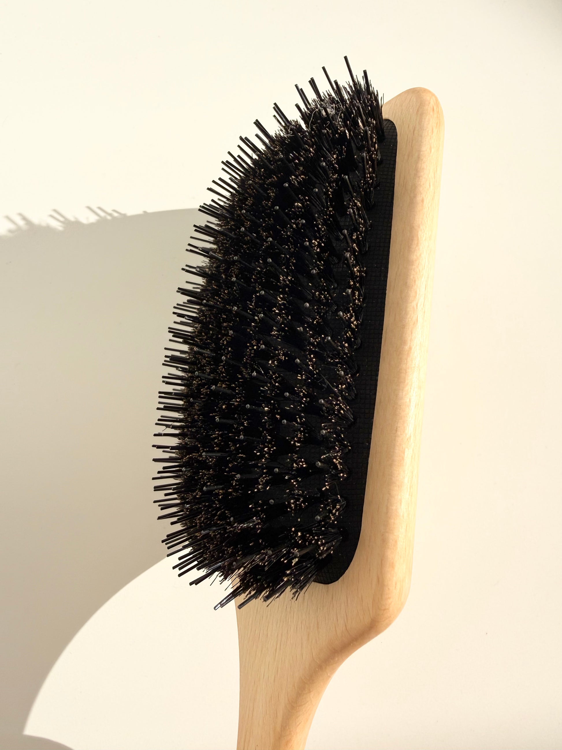 Natural boar bristles: - act as a hair care treatment - distribute sebum from roots to ends - provide softness and shine to hair - The brush you need for a perfect sleek look.