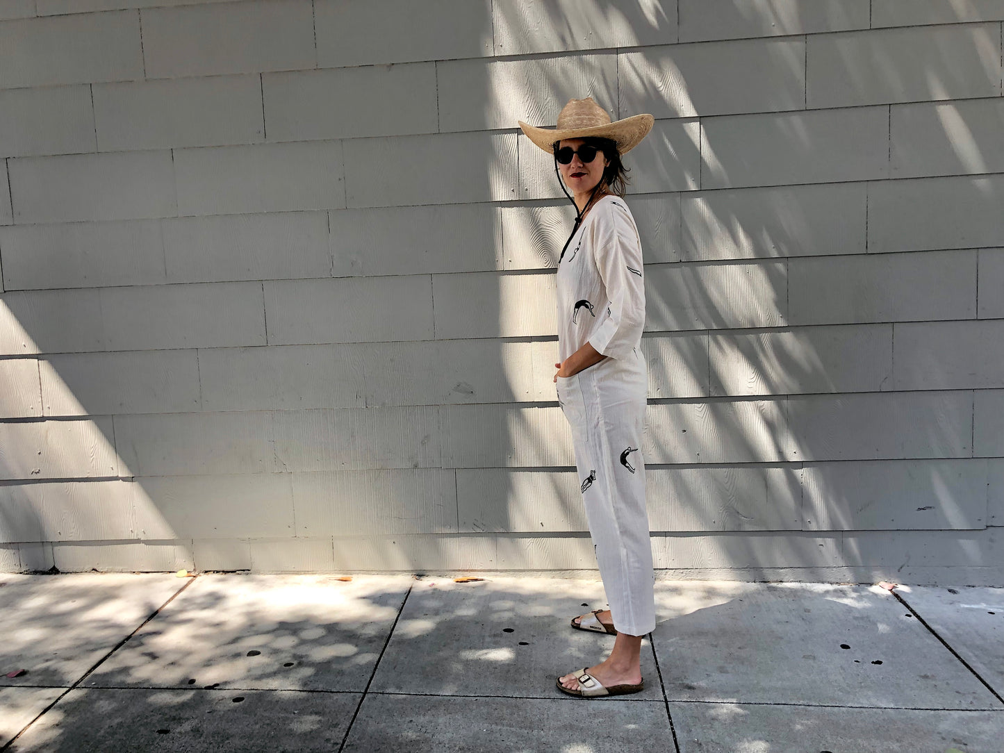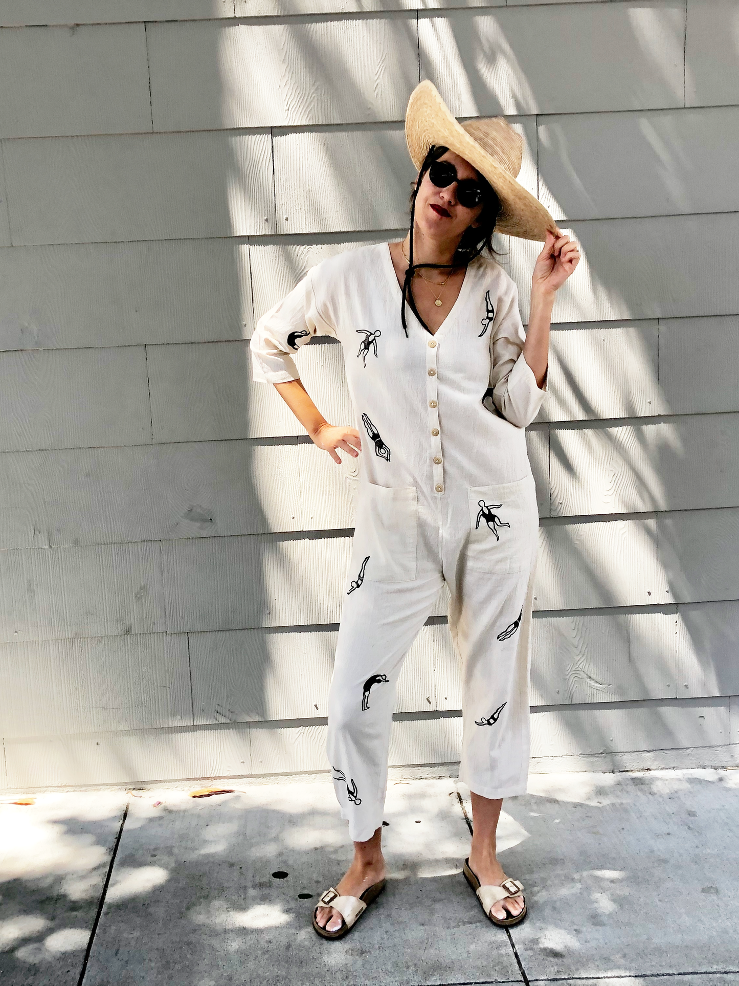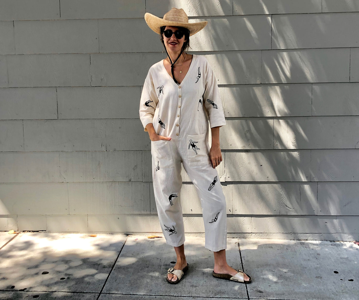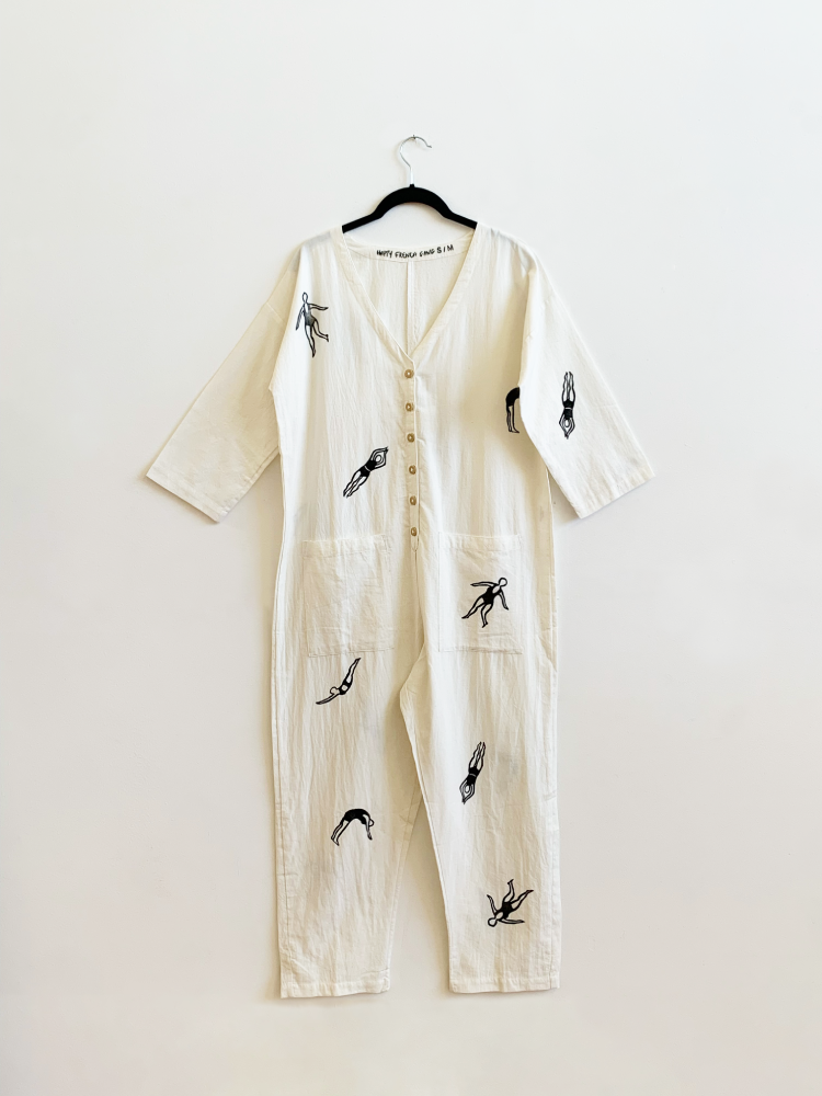 Black swimmers hand-block printed on a natural cotton that's hand-spun and hand-waved in India. One size fits many. Relaxed look.